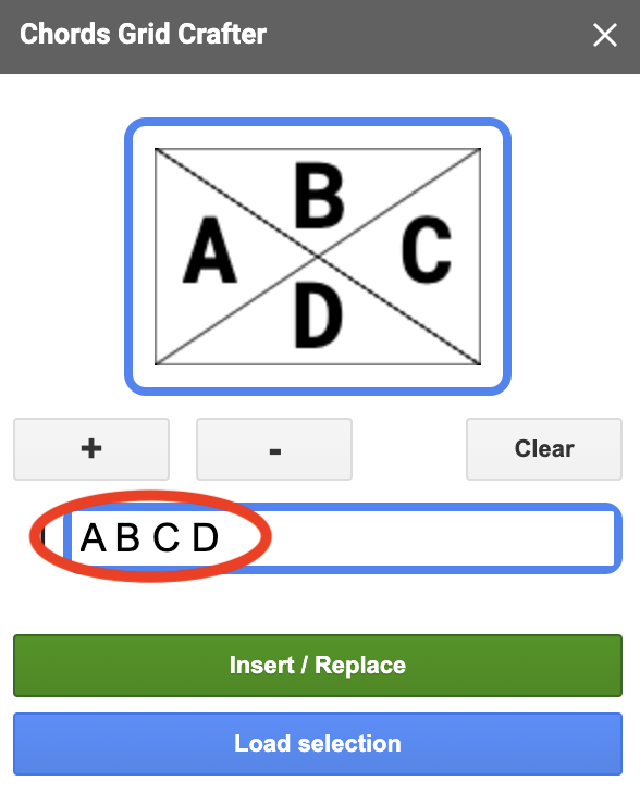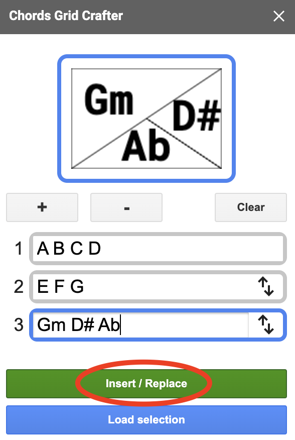 If you need to make some changes to a Chords Grid you previously created simply select it in your document and click the Load selection button.