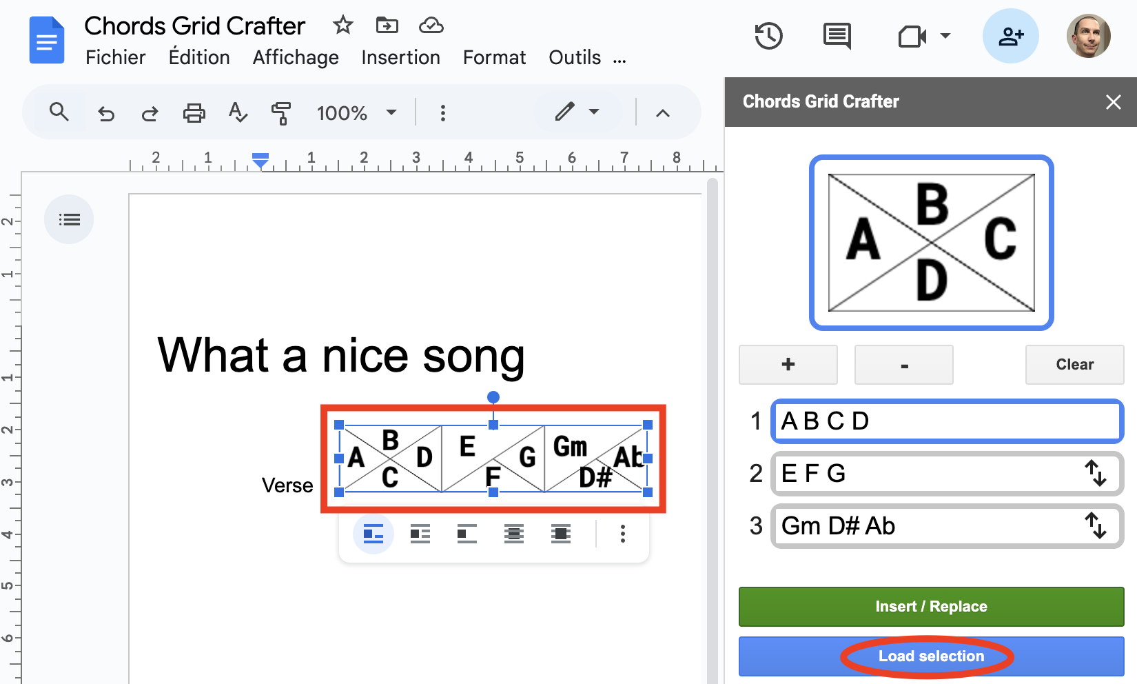 This add-on is meant to help you to write and maintain your Chords Grids straight from your Google Docs document.